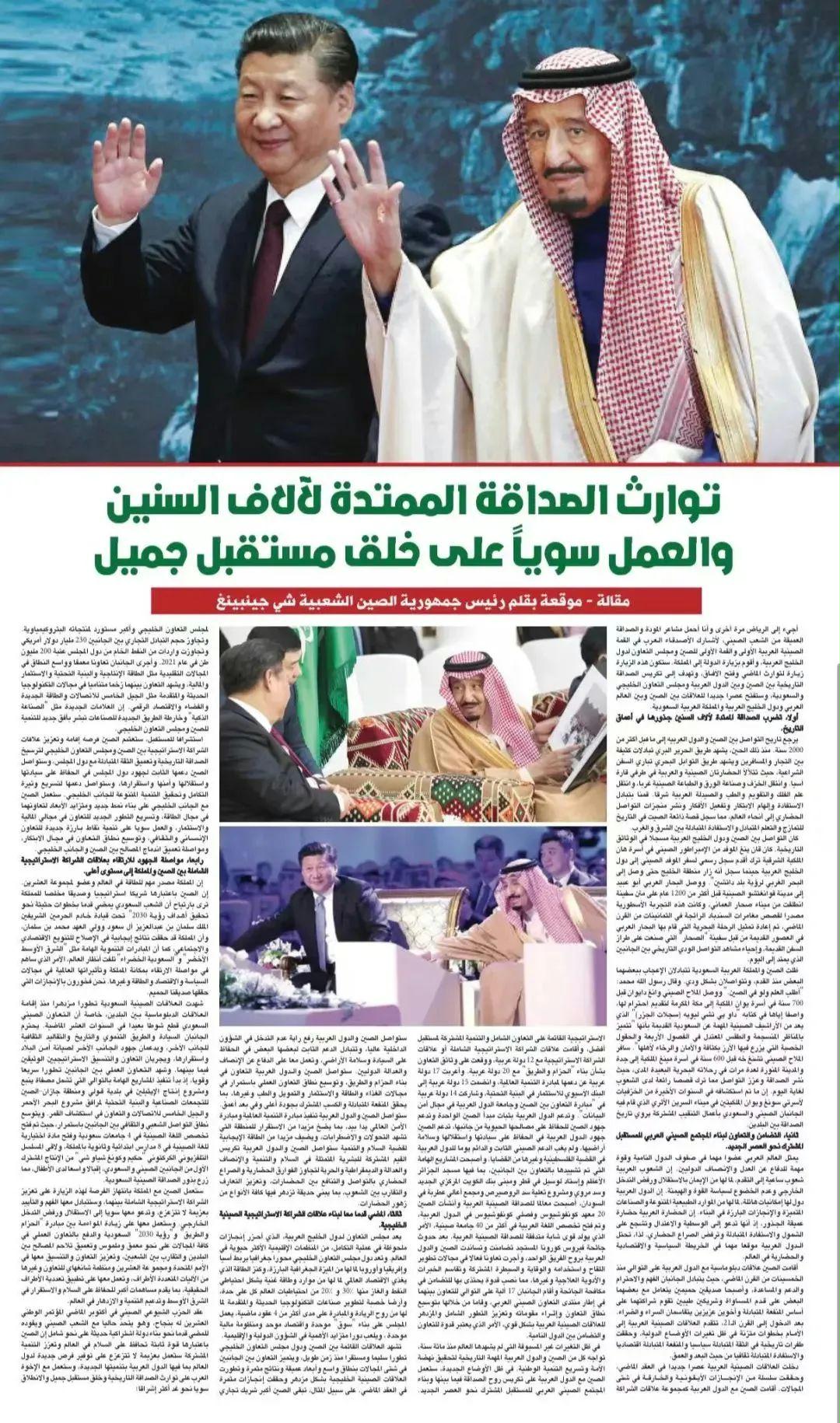12月8日,在抵達(dá)利雅得出席首屆中國-阿拉伯國家峰會(huì)、中國-海灣阿拉伯國家合作委員會(huì)峰會(huì)并對沙特進(jìn)行國事訪問之際,國家主席習(xí)近平在沙特《利雅得報(bào)》發(fā)表題為《傳承千年友好,共創(chuàng)美好未來》的署名文章。