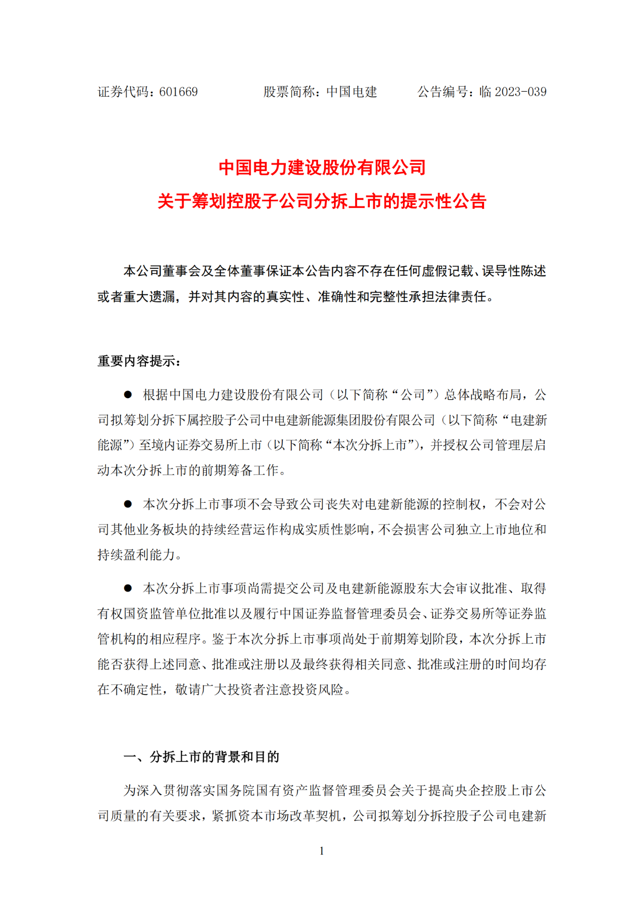 6月2日晚間,中國電力建設(shè)股份有限公司發(fā)布《關(guān)于籌劃控股子公司分拆上市的提示性公告》,擬將旗下中電建新能源集團(tuán)股份有限公司拆分至境內(nèi)上市,中國電建以新能源為核心的戰(zhàn)略轉(zhuǎn)型升級(jí)進(jìn)程,邁出了最關(guān)鍵一步。