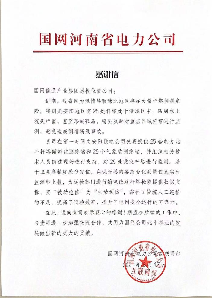 “貴司在第一時(shí)間向安陽供電公司免費(fèi)提供的25套電力北斗桿塔傾斜監(jiān)測(cè)終端和25個(gè)氣象監(jiān)測(cè)終端,為運(yùn)檢部門進(jìn)行輸電線路桿塔檢修提供數(shù)據(jù)支撐,提高了巡檢效率,提升了電網(wǎng)安全運(yùn)行的可靠性……”8月17日,國網(wǎng)信通產(chǎn)業(yè)集團(tuán)思極位置(吉奧)收到一封來自國網(wǎng)河南電力的感謝信,信中對(duì)國網(wǎng)信通產(chǎn)業(yè)集團(tuán)思極位置(吉奧)在本次搶險(xiǎn)救災(zāi)保電中給予的大力支持表示由衷感謝。