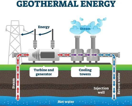 具體操作時(shí),高溫地?zé)猁}水從地表下長達(dá)一英里或更深的儲層中回收。鹽水通過水井上升到地?zé)岚l(fā)電廠,鹽水通過閃蒸產(chǎn)生蒸汽,蒸汽帶動渦輪機(jī)旋轉(zhuǎn)發(fā)電。冷卻后的鹽水通過注水井回到同一儲層,在那里重新加熱并重復(fù)使用。