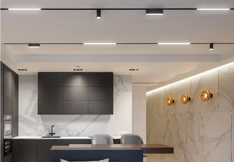 這次裝修時她選擇了更有氛圍感的無主燈設計,雖然也沒有做吊頂,但是可以通過明裝筒燈、射燈、軌道燈、磁吸燈的組合設計,打造一個有空間層次、有照明重點、有氛圍感的光環(huán)境,整個空間的高級感立馬就出來。