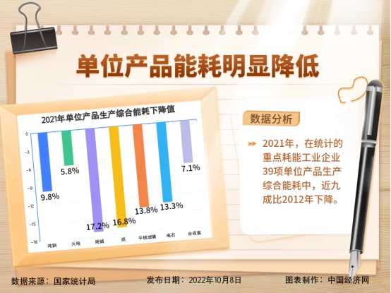 通過推動(dòng)工藝升級(jí)、更新改造用能設(shè)備、加快淘汰落后產(chǎn)能、推廣高效節(jié)能技術(shù),單位產(chǎn)品綜合能耗不斷下降。2021年,在統(tǒng)計(jì)的重點(diǎn)耗能工業(yè)企業(yè)39項(xiàng)單位產(chǎn)品生產(chǎn)綜合能耗中,近九成比2012年下降。其中,噸鋼綜合能耗下降9.8%,火力發(fā)電煤耗下降5.8%,燒堿、機(jī)制紙及紙板、平板玻璃、電石、合成氨生產(chǎn)單耗分別下降17.2%、16.8%、13.8%、13.3%、7.1%。