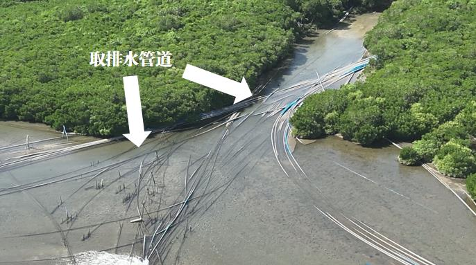 ▲圖5 2023年11月22日,督察組現場督察使用無人機拍攝,養(yǎng)殖塘取排水設施穿越清瀾紅樹林省級自然保護區(qū)核心區(qū)