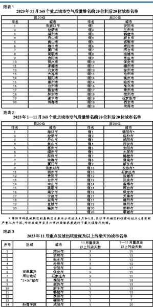 11月,168個重點城市中:空氣質(zhì)量排名前20位城市依次是張家口、拉薩和福州等城市(從第1名至第20名);空氣質(zhì)量排名后20位城市依次是安陽、蘭州和鶴壁等城市(從倒數(shù)第1名至并列倒數(shù)第18名)。見附表1。