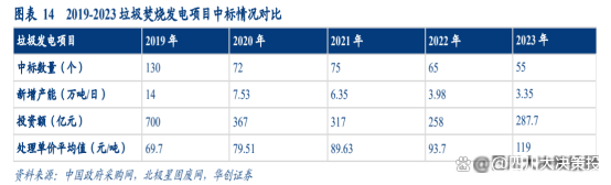 垃圾焚燒新訂單釋放速度繼續(xù)減緩、處理費價格提升。2023 年垃圾焚燒新增體量進一步下降,全年中標項目總處理規(guī)模 3.35 萬噸/日,同比 2022 年下降 15.83%。與此同時,2023 年平均中標處理單價為 119 元/噸,同比 2022 年增長 27%。近三年以來處理費單價一直維持快速上升態(tài)勢,疊加政策推動,我們認為未來垃圾處理費單價有望進一步提升,降低國補退坡的負面影響。