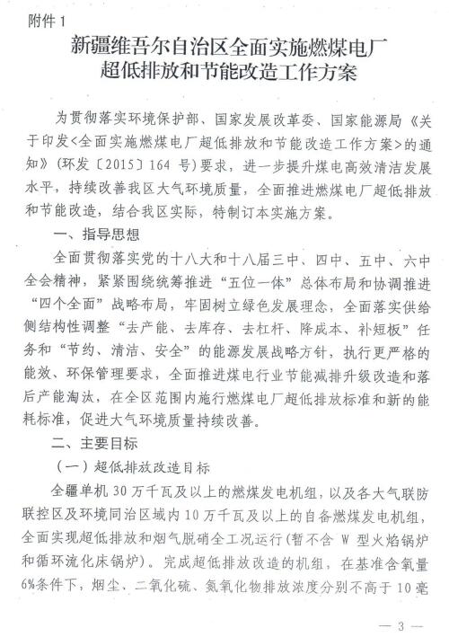 新疆自治區(qū)環(huán)保廳、發(fā)改委、經(jīng)信委、國(guó)家能源局新疆監(jiān)管辦、能源局關(guān)于印發(fā)《新疆維吾爾自治區(qū)全面實(shí)施燃煤電廠超低排放和節(jié)能改造工作方案》的通知(新環(huán)發(fā)[2016]379號(hào))已經(jīng)印發(fā)。方案提出,全面推進(jìn)煤電行業(yè)節(jié)能減排升級(jí)改造和落后產(chǎn)能淘汰,在全區(qū)范圍內(nèi)實(shí)施燃煤電廠超低排放標(biāo)準(zhǔn)和新的能耗標(biāo)準(zhǔn)。方案要求,全疆30萬千瓦及以上燃煤發(fā)電機(jī)組,以及各大氣聯(lián)防聯(lián)控區(qū)及環(huán)境同治區(qū)域內(nèi)10萬千瓦及以上自備燃煤發(fā)電機(jī)組,全面實(shí)行超低排放和煙氣脫硝全工況運(yùn)行(咱不含W型火焰鍋爐和循環(huán)流化床鍋爐)。全文如下: