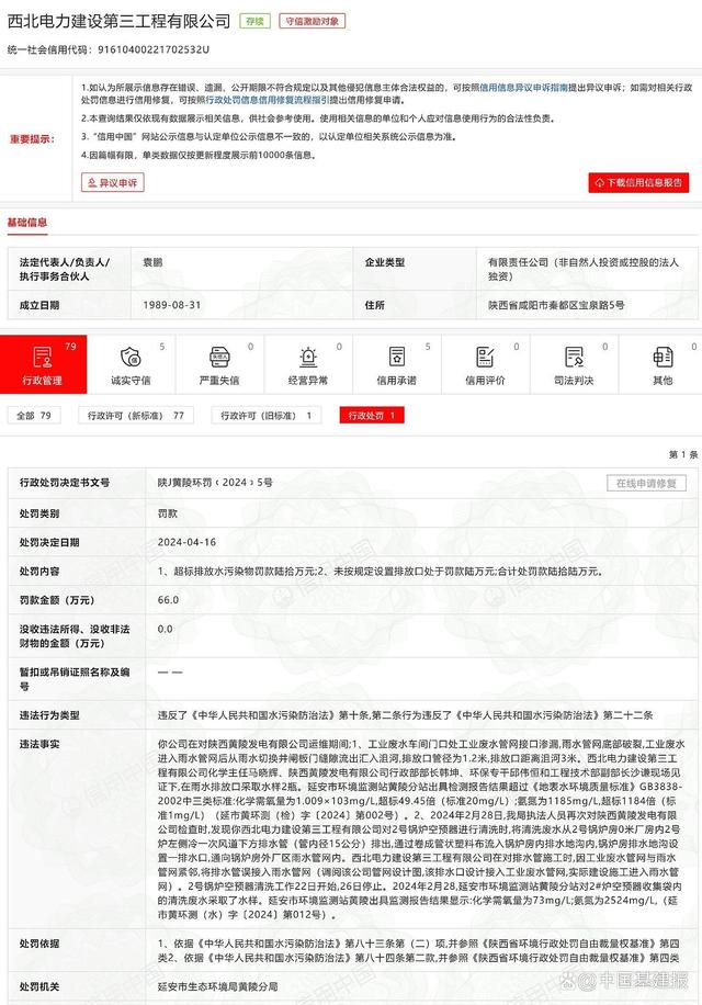 4月27日,本報從信用中國獲悉,由于違反水污染防治法,近日,西北電力建設(shè)第三工程有限公司被罰款66萬元。