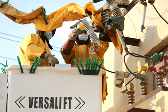中國電力網(wǎng)訊 1月11日,在濰坊壽光市東羅橋村,國網(wǎng)壽光市供電公司帶電作業(yè)人員冒著嚴寒,對10千伏羅橋線東羅1號分支線004號桿損壞的跌落開關(guān)進行緊急搶修,全面消除線路運行缺陷,為農(nóng)村客戶溫暖度冬提供可靠供電保障。