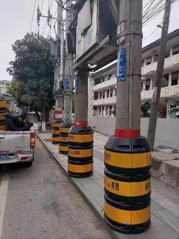 此次安裝的電桿防撞桶顏色為黃黑相間,格外醒目,上面印有國家電網(wǎng)標志,中間印有警示標語。防撞桶為塑料材質,外貼有反光條,具有緩沖撞擊力、夜間反光警示等功能,能有效提醒行人和車輛注意安全,極大地降低了電桿因外力因素而導致的破壞,確保電網(wǎng)安全可靠供電的同時,保障客戶用電安全。