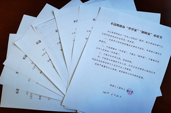 除短信提醒墻外,該公司黨總支重申紀(jì)律要求,組織對公司全體干部員工對家中有升學(xué)子女的職工向公司黨總支備案,督促簽訂《不違規(guī)操辦“升學(xué)宴”“謝師宴”承諾書》8份,并開展集體約談,予以重點監(jiān)督。