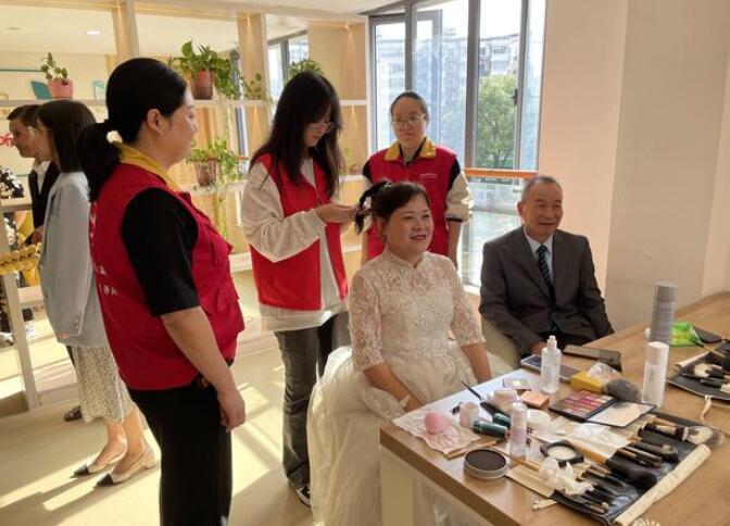 當(dāng)天,該分局青年志愿者早早來(lái)到拍攝場(chǎng)地布置背景墻。不一會(huì)兒,拍攝現(xiàn)場(chǎng)擠滿了前來(lái)照相的老人。活動(dòng)中,一旁的志愿者還會(huì)主動(dòng)上前為老人打理發(fā)型、幫忙整理服飾。“我們結(jié)婚五十多年了,從沒拍過婚紗照,今天在家門口實(shí)現(xiàn)了婚紗夢(mèng),彌補(bǔ)了我們的遺憾,真是太感謝你們了。”年邁的劉奶奶開心地對(duì)志愿者們說道。