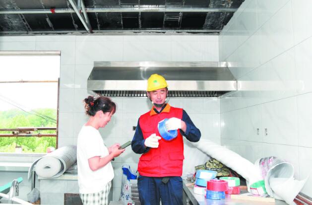 楊棟(右)義務(wù)幫助獐島村漁家樂采買電器并安裝。陳薪成 攝