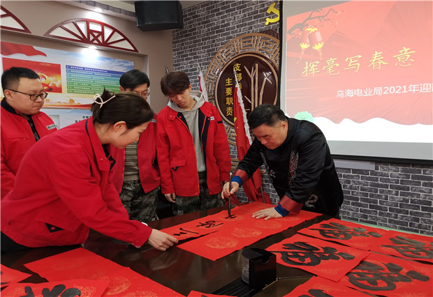 近日,由局工會(huì)和烏海市書法家協(xié)會(huì)聯(lián)合舉辦的“揮毫寫春意,潑墨送吉祥”活動(dòng)來到了基層單位六五四供電分局?;顒?dòng)現(xiàn)場,烏海市書法家協(xié)會(huì)榮譽(yù)主席宋永江揮毫潑墨,行云流水,落筆如云煙,書寫了既有喜迎牛年,辭舊迎新的美好愿景,也有大展宏圖的勵(lì)志語句。一幅幅精彩的書法作品,一句句吉祥如意的春聯(lián),不僅讓基層員工目睹了書法家的風(fēng)采,更為即將來臨的春節(jié)增添了濃濃的節(jié)日氣息。