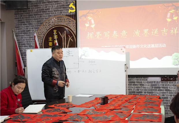 活動(dòng)中不僅觀看了書法大家揮灑自如、展示書法魅力的書寫,還激發(fā)了職工學(xué)習(xí)書法的熱情。宋主席隨即在現(xiàn)場進(jìn)行了書法授課,宋主席用四句話講述了書法要點(diǎn):分割均勻、舉一反三、學(xué)會(huì)分析、穿插移正。精準(zhǔn)的教授,讓現(xiàn)場的青工們躍躍欲試,紛紛拿起手中的毛筆開始練了起來。青工程斌斌說:“宋主席的授課讓我找出了自己在書法中可以進(jìn)步的地方,平常忙于工作,每次想學(xué)習(xí)一下書法都沒有時(shí)間,這次這個(gè)機(jī)會(huì)太好了!”新入職員工也表示宋主席的書法飄若浮云,矯若驚龍,字里行間流露出對分局員工真切的祝福,讓我們心里暖暖的。聲聲問候,情暖人心,送春聯(lián)的同時(shí)也將溫暖送到了分局員工的心里,為即將到來的春節(jié)增添了濃濃的喜慶氛圍,分局職工接過寫滿祝福和美好祝愿的春聯(lián),喜悅之情溢于言表。