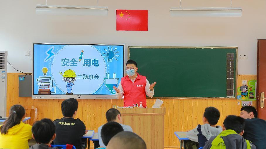 國網(wǎng)浙江諸暨供電公司志愿者在諸暨市東和鄉(xiāng)初中電力愛心教室,為同學(xué)們科普安全用電知識(shí)