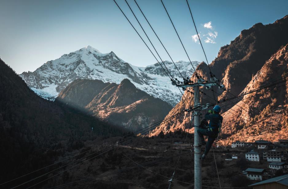收到村民反映停電故障后,旺登一行立即開展檢查,發(fā)現(xiàn)故障出現(xiàn)在雨崩上村2號(hào)臺(tái)區(qū),且需要爬上12米高的電線桿進(jìn)行作業(yè)。只見旺登綁緊安全帶,戴上絕緣手套,踩實(shí)腳扣,并進(jìn)行簡(jiǎn)短的沖擊試驗(yàn)。隨后,他雙手扶住桿體,左腳穩(wěn)穩(wěn)地扣住,接著右腳向上提,一步一步交叉著往上。