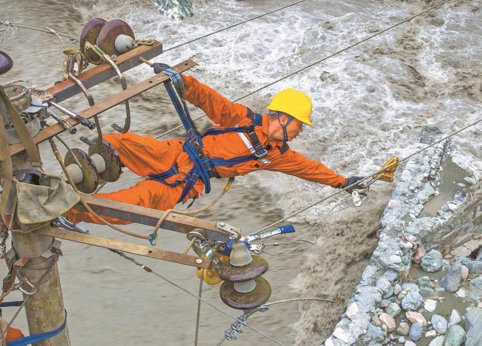 綿陽供電公司增援平武縣電網(wǎng)搶險人員搶修10千伏黃羊線受損線路,于7月27日19時恢復(fù)線路供電。田海 攝