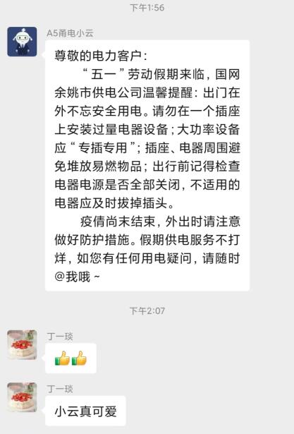 中國(guó)電力網(wǎng)訊 “‘五一’勞動(dòng)節(jié)假期來(lái)臨,國(guó)網(wǎng)余姚市供電公司溫馨提醒:出門(mén)在外不忘安全用電。假期供電服務(wù)不打烊,如您有任何用電疑問(wèn),請(qǐng)隨時(shí)@我哦~”4月29日下午2點(diǎn),余姚市陽(yáng)光水岸小區(qū)微信群中收到這樣一條微信,受到小區(qū)群眾的一致好評(píng)。