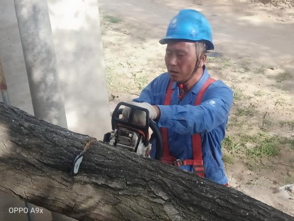 在現(xiàn)場,工作電鋸的呲呲聲、斧頭的敲打聲、腳扣攀登電桿的噠噠聲......每位工作人員全然顧不上天氣的悶熱,井然有序的全身心投入,“高空”開展伐樹、修剪作業(yè),不一會汗水就濕透了衣背。