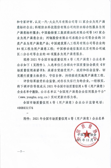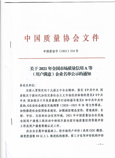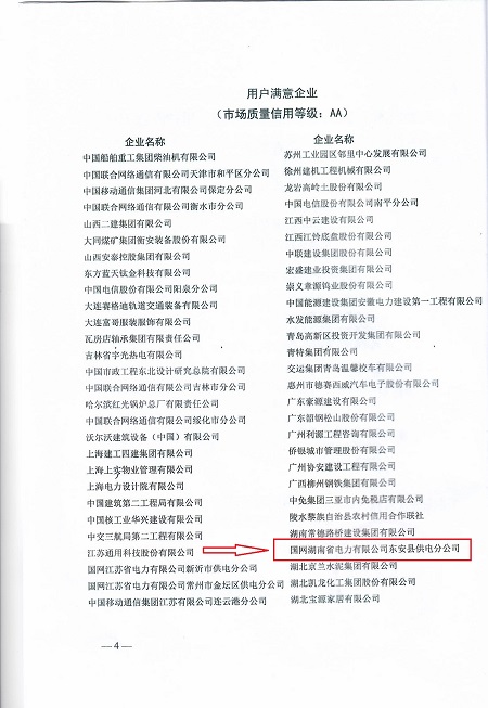 中國電力網(wǎng)訊 2021年11月18日,中國質(zhì)量協(xié)會發(fā)布了關(guān)于2021年全國市場質(zhì)量信用A等(用戶滿意)企業(yè)名單的通知(中國質(zhì)協(xié)字【2021】210號文)。經(jīng)過自愿申請、資料初審、第三方信用評價機構(gòu)評價和專家評審,國網(wǎng)湖南省東安縣供電分公司被評為用戶滿意企業(yè),市場質(zhì)量信用等級AA。
