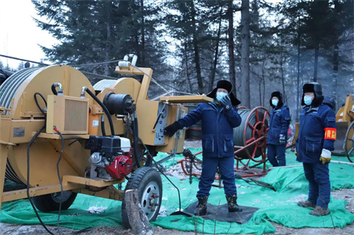 牽引機(jī)、電纜軸快速轉(zhuǎn)動(dòng),粗實(shí)的導(dǎo)線(xiàn)順著前方的鐵塔上的滑輪緩緩回收,導(dǎo)地線(xiàn)展放、張力緊線(xiàn)、附件安裝、導(dǎo)線(xiàn)壓接……冬季的寒風(fēng)刺骨,施工人員顧不上寒冷,加緊施工。