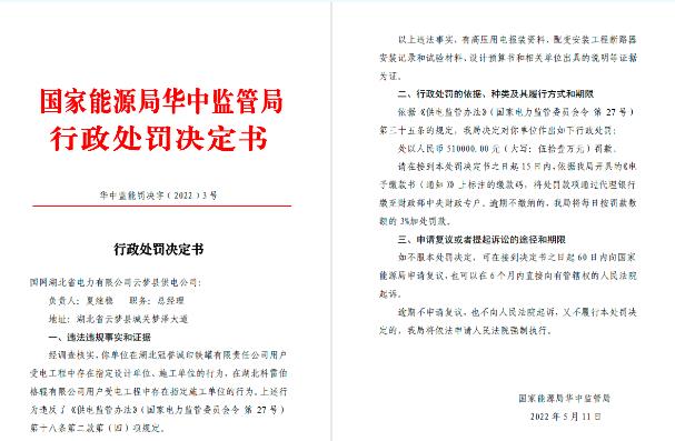 因指定設(shè)計(jì)施工單位,國(guó)網(wǎng)湖北云夢(mèng)縣供電公司被罰51萬(wàn)