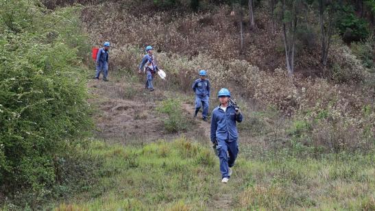 南方電網(wǎng)輸電運(yùn)維人員走在山路上,前往山嶺上對輸電線路開展特巡特維。