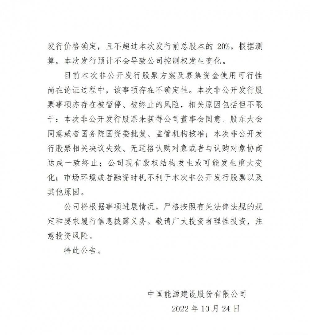 10月23日,中國能建公告稱,為助力公司“30·60”戰(zhàn)略目標落地,構(gòu)筑新能源、新基建、新產(chǎn)業(yè)“三新”發(fā)展平臺,公司正在籌劃非公開發(fā)行A股股票事項,擬將募集資金用于以新能源為主的新型綜合能源項目,包括光伏、風電、氫能、儲能等新能源一體化、專業(yè)化項目,新能源工程施工項目、新能源重大裝備采購,以及生態(tài)環(huán)境治理、新型基礎設施等項目。據(jù)悉,本次募集資金總額在人民幣150億元以內(nèi)。本次非公開發(fā)行股票方案最終以經(jīng)公司董事會、股東大會批準及國務院國資委批復、本公司證券上市地的證券監(jiān)管機構(gòu)核準的方案為準。