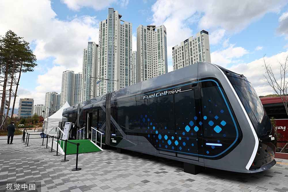 當(dāng)?shù)貢r(shí)間2021年11月10日,韓國蔚山,當(dāng)?shù)嘏e行“2021年蔚山國際氫能博覽會暨論壇“(H2WORLD),展出氫燃料電池車輛,并鼓勵(lì)氫能源的使用。人民視覺 資料圖