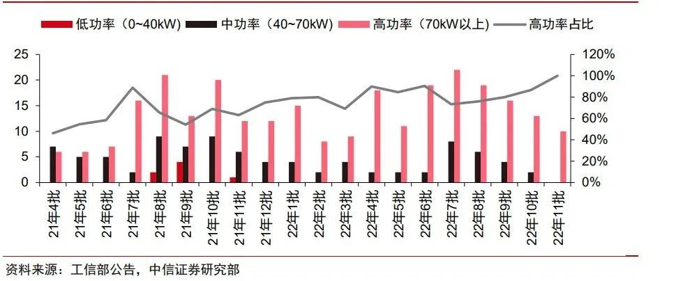 入圍車(chē)型延續(xù)了高功率化的趨勢(shì)。車(chē)型結(jié)構(gòu)方面,根據(jù)中信保上險(xiǎn)量數(shù)據(jù),顯示2022年1~11月客車(chē)占比從1月的83%逐漸縮減到11月的9%,重卡占比從1月的9%逐漸增加到11月的51%,并且2022年1~3Q重卡主要在氫能源較為豐富的地區(qū)推廣,我們認(rèn)為重卡有望繼續(xù)保持主導(dǎo)地位并率先實(shí)現(xiàn)經(jīng)濟(jì)性。