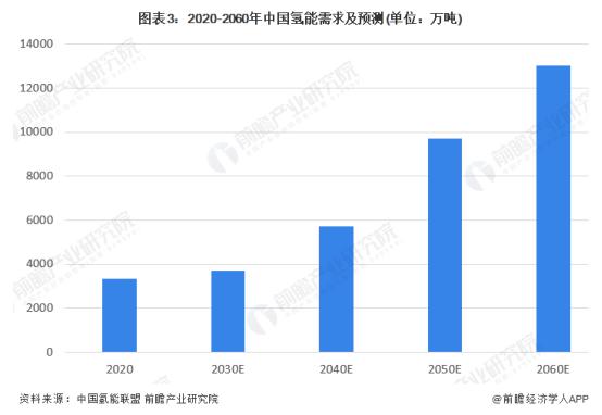 根據(jù)中國(guó)氫能聯(lián)盟的預(yù)測(cè),2020 年以后中國(guó)氫能需求將持續(xù)增加,尤其是 2030 年以后,為達(dá)成 " 碳中和、碳達(dá)峰 " 的目標(biāo),氫能需求量將大增。到 2060 年,中國(guó)氫能年需求將超過 1.3 億噸。