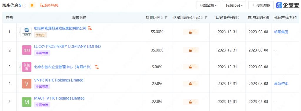 據(jù)企查查顯示,8 月 8 日,北京明陽氫能科技有限公司注冊成立,該公司注冊資本 2000 萬元,由風(fēng)電龍頭企業(yè)明陽集團、祿順有限公司(LUCKY PROSPERITY COMPANY LIMITED)、北京永氫宏企業(yè)管理中心 ( 有限合伙 ) 等多家單位共同持股,其中明陽集團持有 55% 股份、為最大股東,明陽集團董事長張傳衛(wèi)擔(dān)任該公司法定代表人。