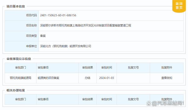 近日,深能鄂爾多斯市鄂托克前旗上海廟經(jīng)濟(jì)開發(fā)區(qū)光伏制氫項目配套輸氫管道工程獲批,鄂托克前旗能源局就該項目發(fā)布《項目備案告知書》。本項目屬于深能鄂爾多斯市鄂托克前旗上海廟經(jīng)濟(jì)開發(fā)區(qū)光伏制氫項目配套輸氫管道工程,新建一條DN150mm輸氫管線,供氣流量約5000標(biāo)方每小時,管線長度約2km,起于深能北方(鄂托克前旗)能源開發(fā)有限公司鄂爾多斯市鄂托克前旗上海廟經(jīng)濟(jì)開發(fā)區(qū)光伏制氫項目,止于潤陽悅達(dá)光伏裝備制造全產(chǎn)業(yè)鏈科技示范項目。
