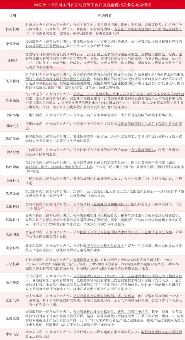 據(jù)財聯(lián)社不完全統(tǒng)計,科新機電、凌云股份、德固特、凱立新材、泛亞微透、中集車輛、國機汽車、駱駝股份、中儲股份、億緯鋰能、中核科技、凱龍股份、金能科技、昇輝科技、全柴動力、北京科銳、石化機械、圣元環(huán)保、金宏氣體、金博股份和津榮天宇在內(nèi)的21家上市公司本周在互動易等平臺回復(fù)氫能源相關(guān)業(yè)務(wù)情況。其中,德固特今日發(fā)布投資者機構(gòu)調(diào)研時表示,公司目前已經(jīng)參與并為制氫領(lǐng)域客戶提供過工藝裝備。凱立新材今日在互動平臺表示,公司在氫產(chǎn)業(yè)鏈布局的項目進展具體為:與制氫相關(guān)的PEM電解水制氫催化劑的在研項目達到完成百克級穩(wěn)定生產(chǎn)階段。具體情況如下圖:
