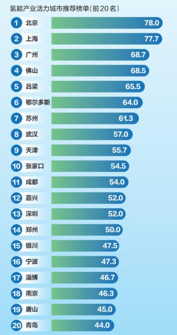 基于全國氫能產(chǎn)業(yè)發(fā)展的地區(qū)分布特點 ,新京報零碳研究院對主要城市的氫能資源稟賦 、政策環(huán)境 、產(chǎn)業(yè)規(guī)模 、項目投資 、基礎(chǔ)設(shè)施和企業(yè)數(shù)量等維度數(shù)據(jù)進(jìn)行了量化和綜合評價 ,篩選出了全國20個氫能產(chǎn)業(yè)發(fā)展活力城市 。具體城市名單如下: