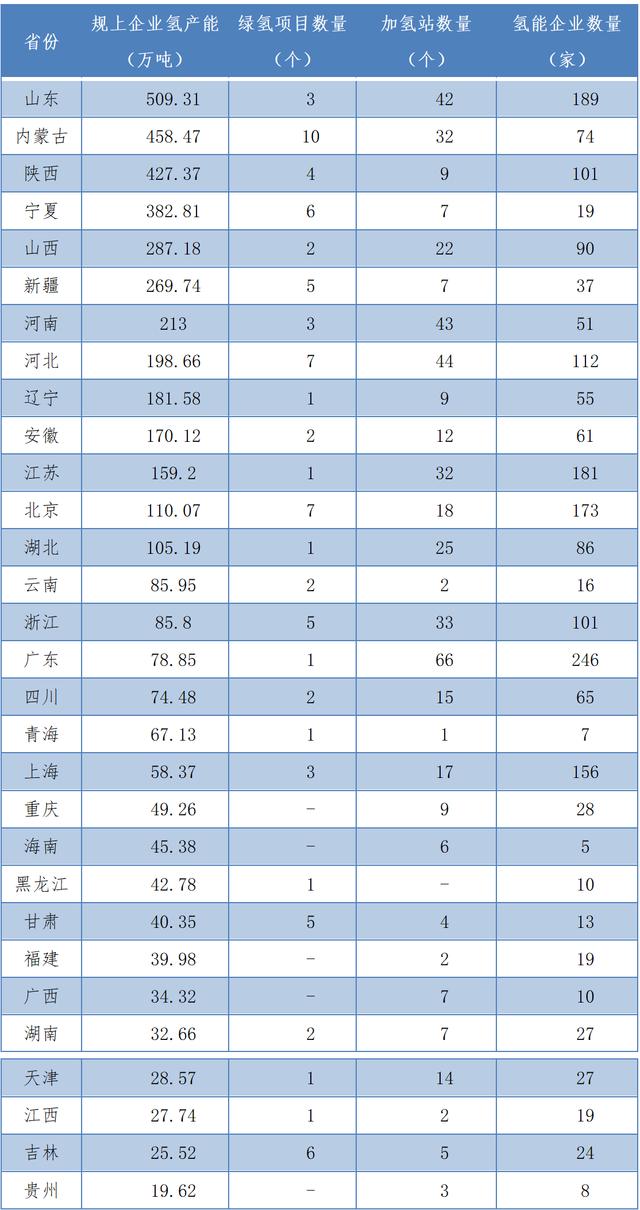 根據(jù)氫能產(chǎn)業(yè)大數(shù)據(jù)平臺數(shù)據(jù),山東、內(nèi)蒙古和陜西三地規(guī)模以上企業(yè)氫產(chǎn)能分別達(dá)到509.31萬噸、458.47萬噸和427.37萬噸,氫氣產(chǎn)能排名全國第一名、第二名和第三名。