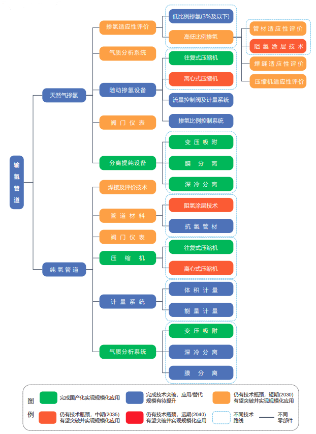 在高壓輸氫管道材料開發(fā)方面,高鋼級抗氫管材及阻氫涂層技術是當前管材開發(fā)的重點,可顯著提高管道的輸氫能力,國內(nèi)預計在2030年左右取得突破并進入試用階段。