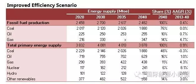在大大提高能效的情境下,2040年一次能源供應(yīng)只有38.78億噸標(biāo)油,其中煤炭仍占48%、石油16%、天然氣11%、核電6%、水電3%、非水可再生能源14%。從發(fā)電量來看,2040年總裝機(jī)達(dá)2665吉瓦,發(fā)電量達(dá)9.39萬億千瓦時,煤電占51%、天然氣發(fā)電6%、核電10%、水電16%、風(fēng)電 10%、光伏4%、生物質(zhì)4%。