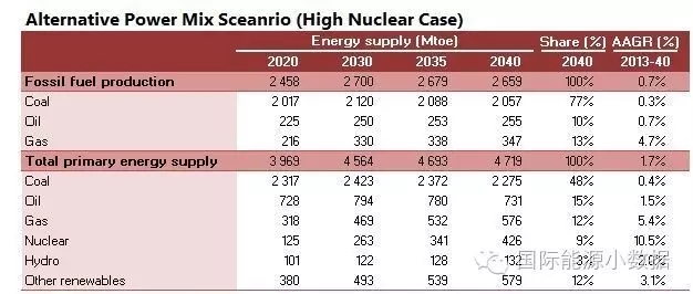 在高核電比例的情境下,2040年一次能源供應(yīng)達(dá)到47.19億噸標(biāo)油,其中煤炭占48%、石油15%、天然氣12%、核電9%、水電3%、非水可再生能源12%。從發(fā)電量來看,2040年總裝機(jī)達(dá)3146吉瓦,發(fā)電量達(dá)11.78萬億千瓦時,燃煤發(fā)電占51%、天然氣發(fā)電8%、核電14%、水電13%、風(fēng)電8%、光伏3%、生物質(zhì)3%。