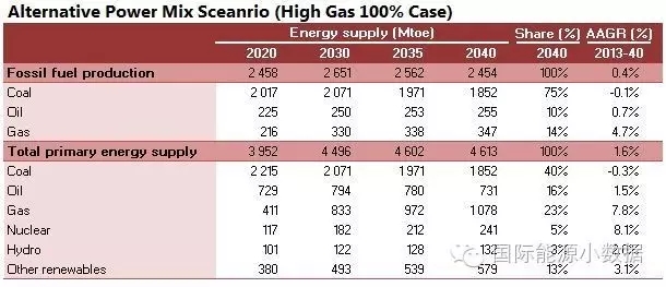 在大力推廣天然氣發(fā)電的情境下,2040年一次能源供應(yīng)為46.13億噸標(biāo)油,其中煤炭跌至40%、石油16%、天然氣高達(dá)23%、核電5%、水電3%、非水可再生能源13%。從發(fā)電量來看,2040年總裝機(jī)達(dá)3146吉瓦,發(fā)電量達(dá)11.78萬億千瓦時,煤電占36%、天然氣發(fā)電30%、核電8%、水電 13%、風(fēng)電8%、光伏3%、生物質(zhì)3%。