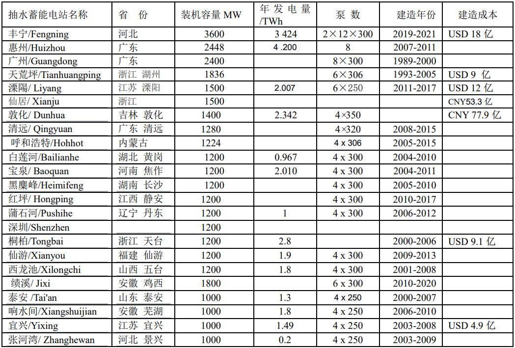 中國裝機容量大于1000MW運行的抽水蓄能電站