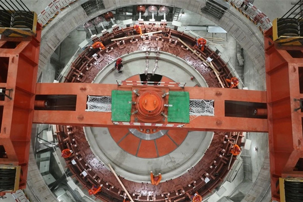圖為雙江口水電站首臺(tái)機(jī)組轉(zhuǎn)子順利吊裝就位