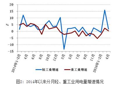 1-4月份,全國工業(yè)用電量12369億千瓦時,同比增長0.2%,增速比上年同期提高1.0個百分點,占全社會用電量的比重為68.4%,對全社會用電量增長的貢獻率為4.5%。其中,輕工業(yè)用電量2075億千瓦時,同比增長3.6%,增速比上年同期提高1.7個百分點;重工業(yè)用電量為10295億千瓦時,同比下降0.5%,增速比上年同期提高0.8個百分點。