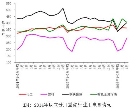 1-4月份,化學(xué)原料制品、非金屬礦物制品、黑色金屬冶煉、有色金屬冶煉四大高載能行業(yè)用電量合計5267億千瓦時,同比下降 4.4%,增速比上年同期回落2.7個百分點;合計用電量占全社會用電量的比重為29.1%,對全社會用電量增長的貢獻率為-47.8%。其中,化工行業(yè)用電量1405億千瓦時,同比增長4.0%,增速比上年同期提高1.1個百分點;建材行業(yè)用電量858億千瓦時,同比下降2.2%,增速比上年同期提高4.3個百分點;黑色金屬冶煉行業(yè)用電量1443億千瓦時,同比下降11.6%;增速比上年同期回落4.7個百分點;有色金屬冶煉行業(yè)1562億千瓦時,同比下降5.4%,增速比上年同期回落9.1個百分點。