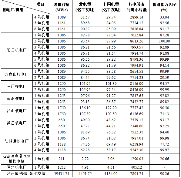 3)本表“合計值/整體值/平均值”中,裝機容量、發(fā)電量、上網電量為各機組合計值,核電設備利用小時數為全部機組整體值,機組能力因子為全部參與統(tǒng)計機組的算數平均值。