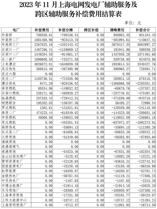 附件:2023年10-12月上海電網(wǎng)發(fā)電廠輔助服務及跨區(qū)輔助服務補償費用結算表