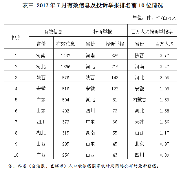 各?。ㄗ灾螀^(qū)、直轄市)按照收到的有效信息數(shù)量排序,河南、河北、陜西、安徽、廣東等省列全國前10位;按照投訴舉報數(shù)量排序,河南、河北、陜西、安徽、湖北等省排在全國前10位。按照百萬人均投訴舉報率排序,陜西、河南、河北、安徽、內(nèi)蒙古等省位于全國前10位。(2017年7月有效信息及投訴舉報排名前10位情況見表三)