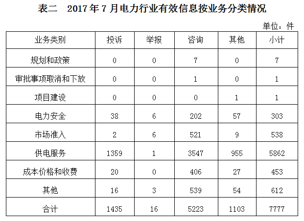 2017年7月收到的有效信息中,電力行業(yè)類7777件,占88.26%;新能源和可再生能源行業(yè)類494件,占5.61%;石油天然氣行業(yè)類20件,占0.23%;煤炭行業(yè)類2件,占0.02%;其他事項518件,占5.88%。