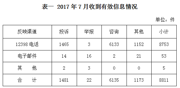 按反映渠道分類,12398電話8753件,電子郵件53件,其他5件。(2017年7月收到有效信息情況見表一)