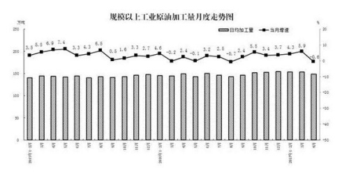 原油加工量下降。4月份,原油加工量4445.2萬噸,同比下降0.6%;日均加工量148.2萬噸,比3月份下降3.3%,這主要是受部分大型石化企業(yè)停產(chǎn)檢修影響。主要成品油生產(chǎn)也有所回落,其中,汽油產(chǎn)量同比下降4.0%,煤油產(chǎn)量增長2.2%,柴油產(chǎn)量下降0.6%。1-4月份,原油加工量18251.0萬噸,同比增長3.1%,比1-3月份回落1.4個百分點。